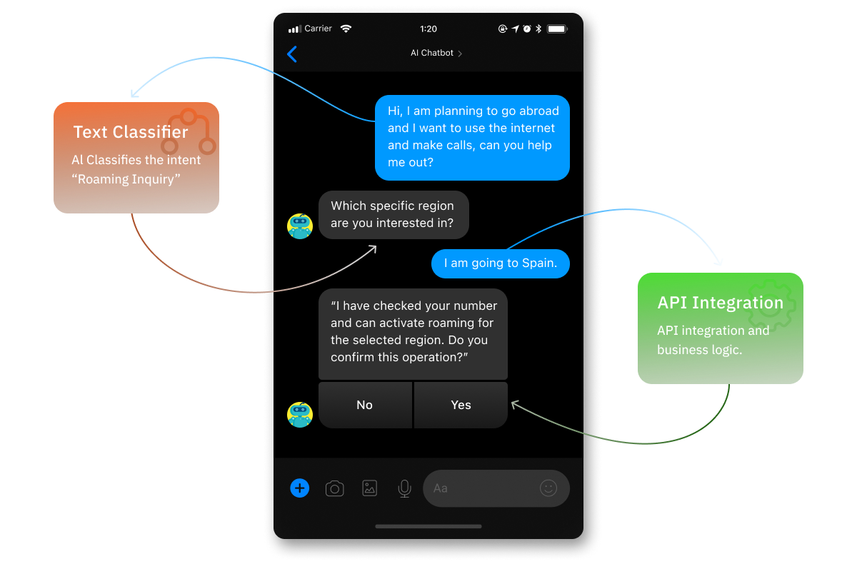 Users can ask the bot a question as if they were talking to other humans. An AI text classifier allows it to decipher the meaning of the question. Using the dialogue tree, the bot asks a sequence of other questions. The answers help to point out the issue to be solved and the best way to do it. The bot can provide users with information, or a link to self-service instructions. But with access to the API of the back-end systems, it can perform the tasks they require.